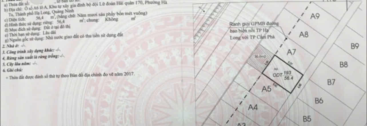Diện tích: 59,4m² (diện tích sử dụng 90m²). - Nhà măt tiền đường khu dân cư sầm uất. - Giao thông thuận tiện. - Phù hợp cho sinh sống lập nghiêp. - Có thể ở và kinh doanh buôn bán. - Nhà xây kiên cố. Nhà gồm: 3 tầng, 4 phòng ngủ, 2 vệ sinh. - Đầy đủ tiện ích, gần đường, trường, trạm.. Giá bán: Thỏa thuận.Bán nhanh lô đất chính chủ vị trí đẹp tại Hà Trung, TP. Hạ Long, Quảng Ninh