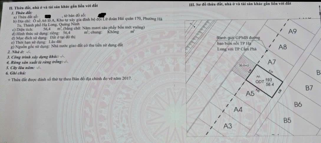 Chính chủ cần bán đất mặt đường bao biển Hạ Long – Cẩm Phả khu dự án Lữ đoàn Hải Quân 170. Lô đất có vị trí đẹp, cách bãi tắm Hòn Gai chỉ 1 phút chạy xe. Diện tích: 56,4m2 (chiều ngang 6m*dài 9,4m) Hướng: Tây Bắc Bìa đỏ chính chủ Liên hệ chủ đất: Chị Thủy – 0915517989.Bán đất sát mặt đường quốc lộ cách siêu dự án Hạ Long Xanh Vingroup 800m tại Hà Khẩu-Hạ Long-QN